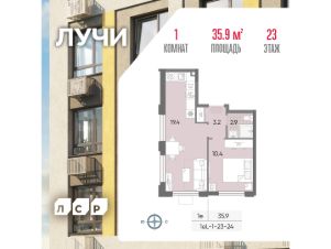 Продается 1-комнатная квартира общей площадью 35.9 кв. метров на 23 этаже жилого комплекса Лучи.