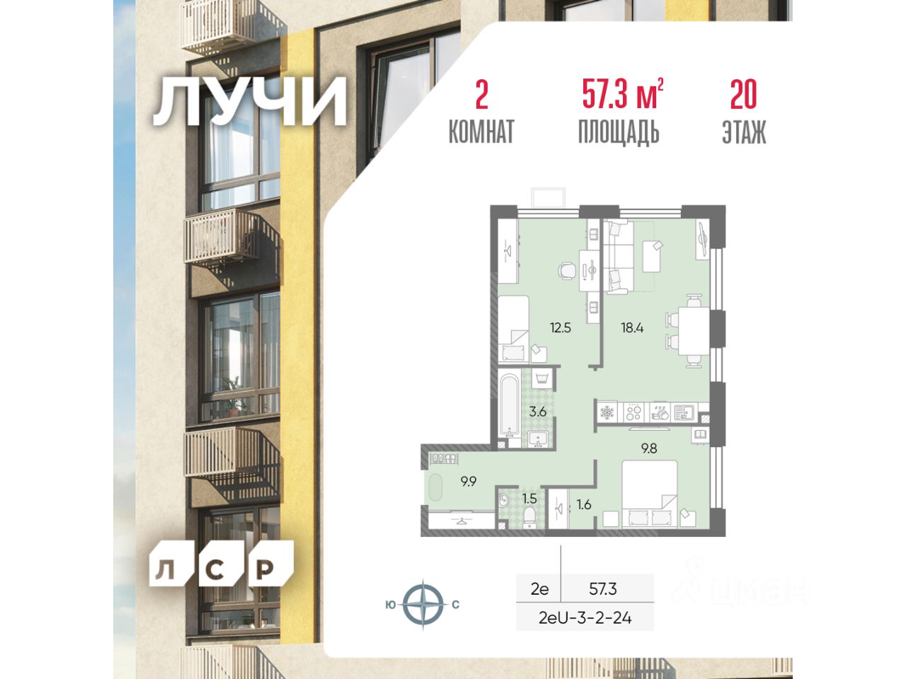 Продается 2-комнатная квартира общей площадью 57.3 кв. метров на 20 этаже жилого комплекса Лучи.