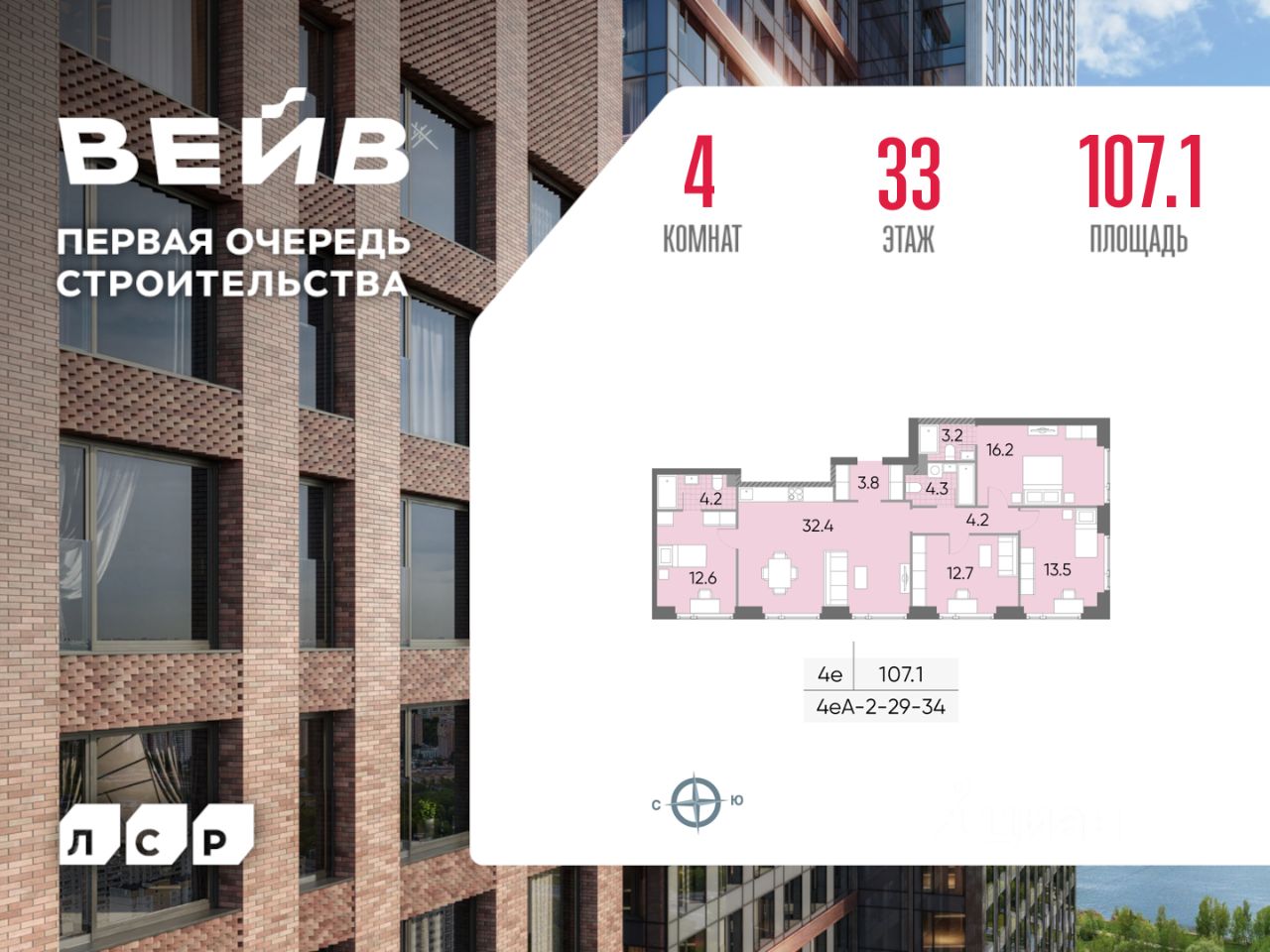 Продается 4-комнатная квартира общей площадью 107.1 кв. метров на 33 этаже жилого комплекса ВЕЙВ. Комплекс располагается на юге Москвы в районе Москворечье-Сабурово. В пешей доступности расположены станция МЦД "Москворечье" и станция метро "Борисово". Для автомобилистов есть удобное сообщение с Каширским шоссе.