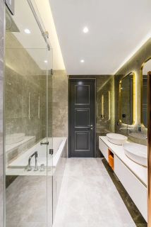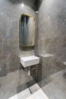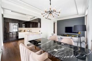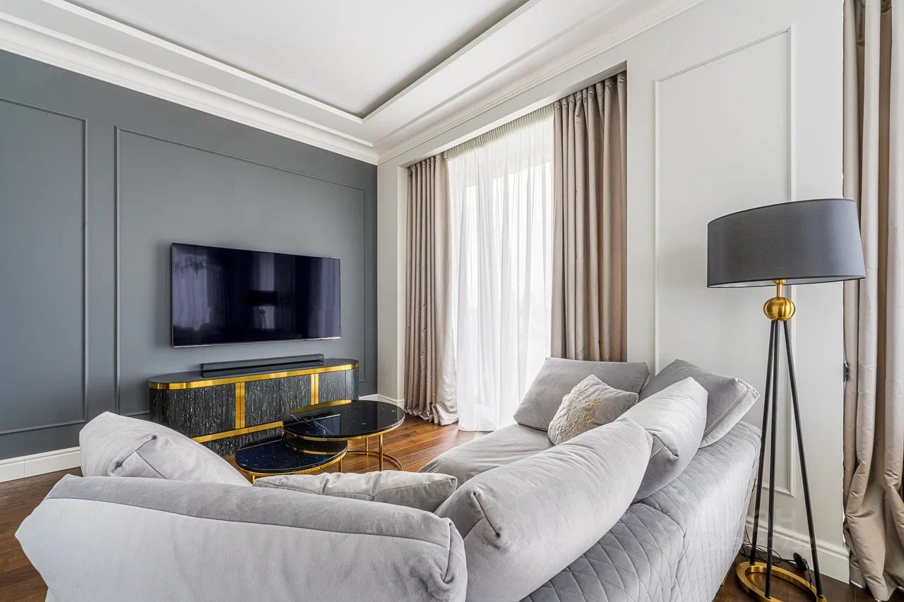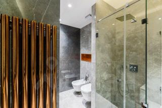 В квартире много дорогостоящих декоративных элементов из настоящей латуни: ручки шкафов, латунные вставки на изголовье кровати, вставки на мебели. Также есть мебель известных дизайнеров - обеденный стол из натурального мрамора с уникальным рисунком, журнальный стол из натурального мрамора, итальянская люстра в обеденной зоне, итальянские бра, обеденные кресла, прикроватные тумбы. Вся сантехника и керамика Villeroy Boch.