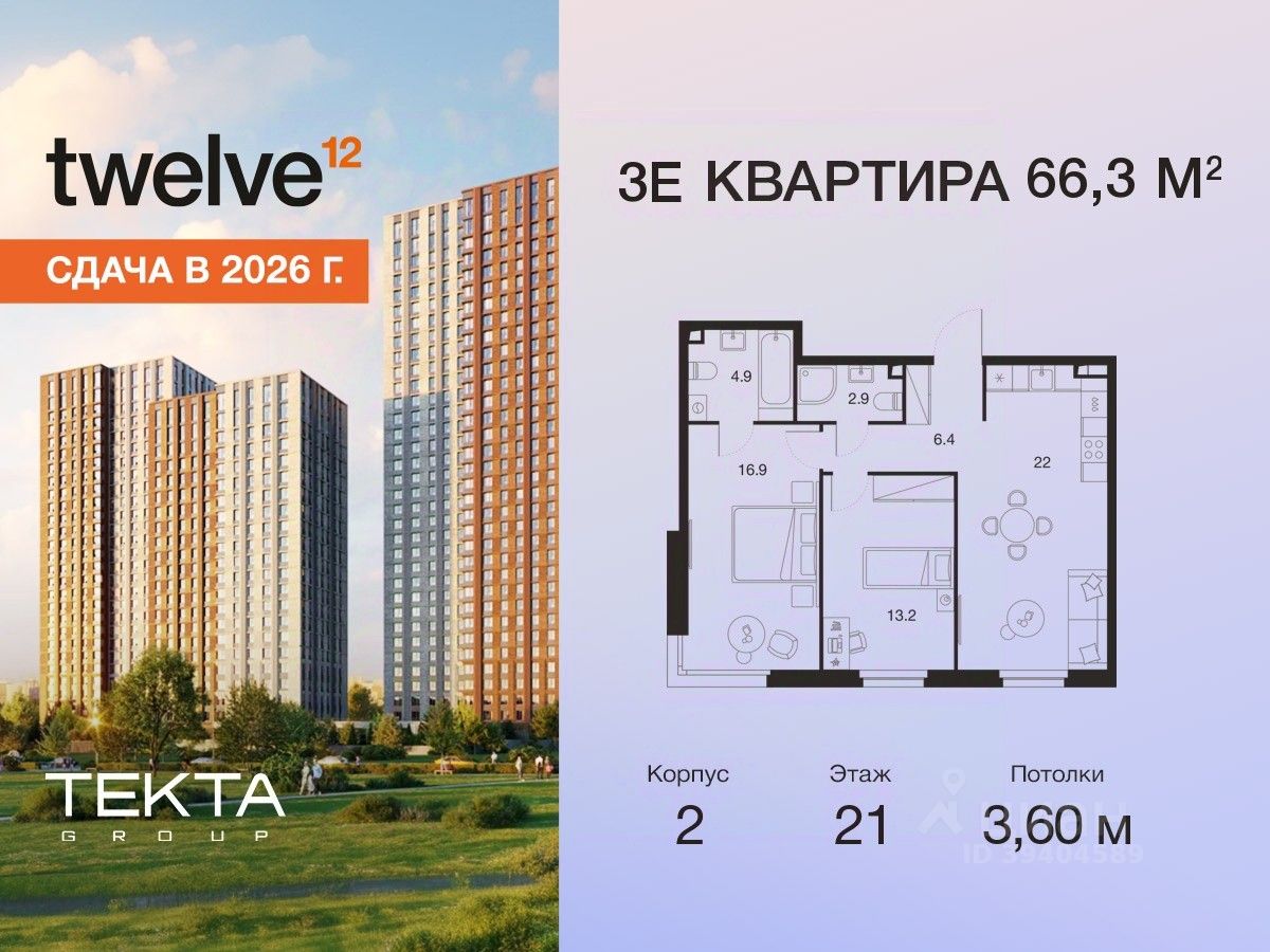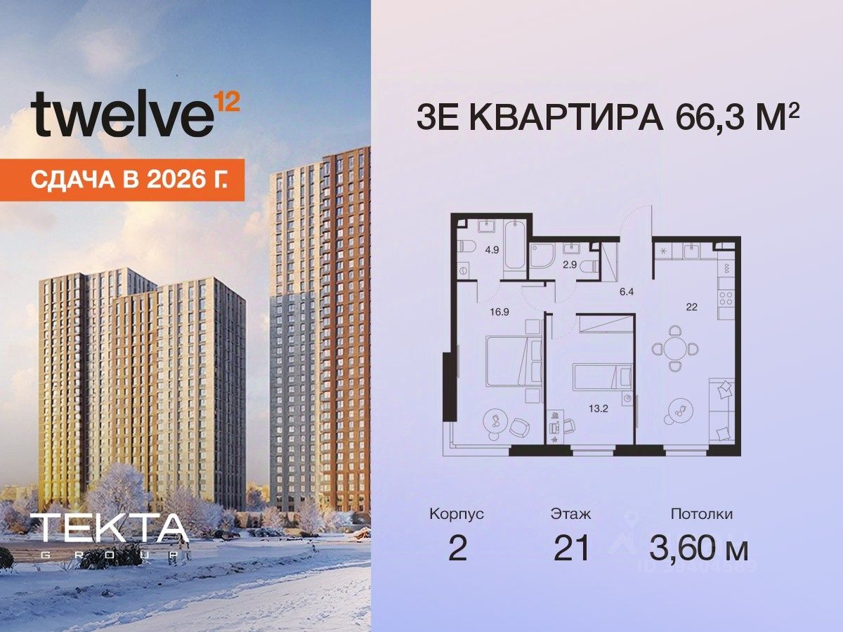 3-комн. квартира в ЖК "Твелв" на 21 этаже в 22 этажном здании Корпус 2. Общая площадь: 66.3 кв.м., жилая: 46.90 кв.м. Высота потолков 3.60 м.