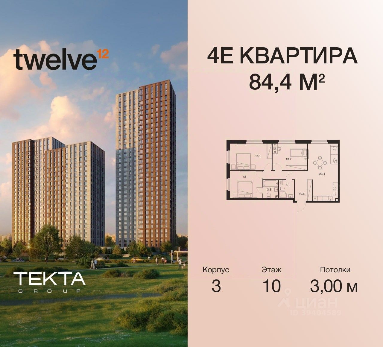4-комн. квартира в ЖК "Twelve" на 10 этаже в 28 этажном здании Корпус 3. Общая площадь: 84.4 кв.м., жилая: 58.00 кв.м. Высота потолков 3.00 м.