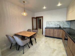 Квартира в новом монолитном доме 2018 года, евротрешка, по планировке большая кухня гостиная 18 м2, 2 спальни, 2 гардеробные комнаты, большой холл, балкон и совмещенный сан узел. Только что сделали дорогой и качественный ремонт, на полу плитка и ламинат, установлены 2 кондиционера. Полностью новая встроенная кухня со всей бытовой техникой и мебелью, никто не жил, продается как есть. На кухне полы керамогранит, в зоне ТВ пол с подогревом. Фасады МДФ (эмаль), корпусная часть ЛДСП (Австрия), фурнитура Hettich (Германия), встраиваемая техника Weissgauff.