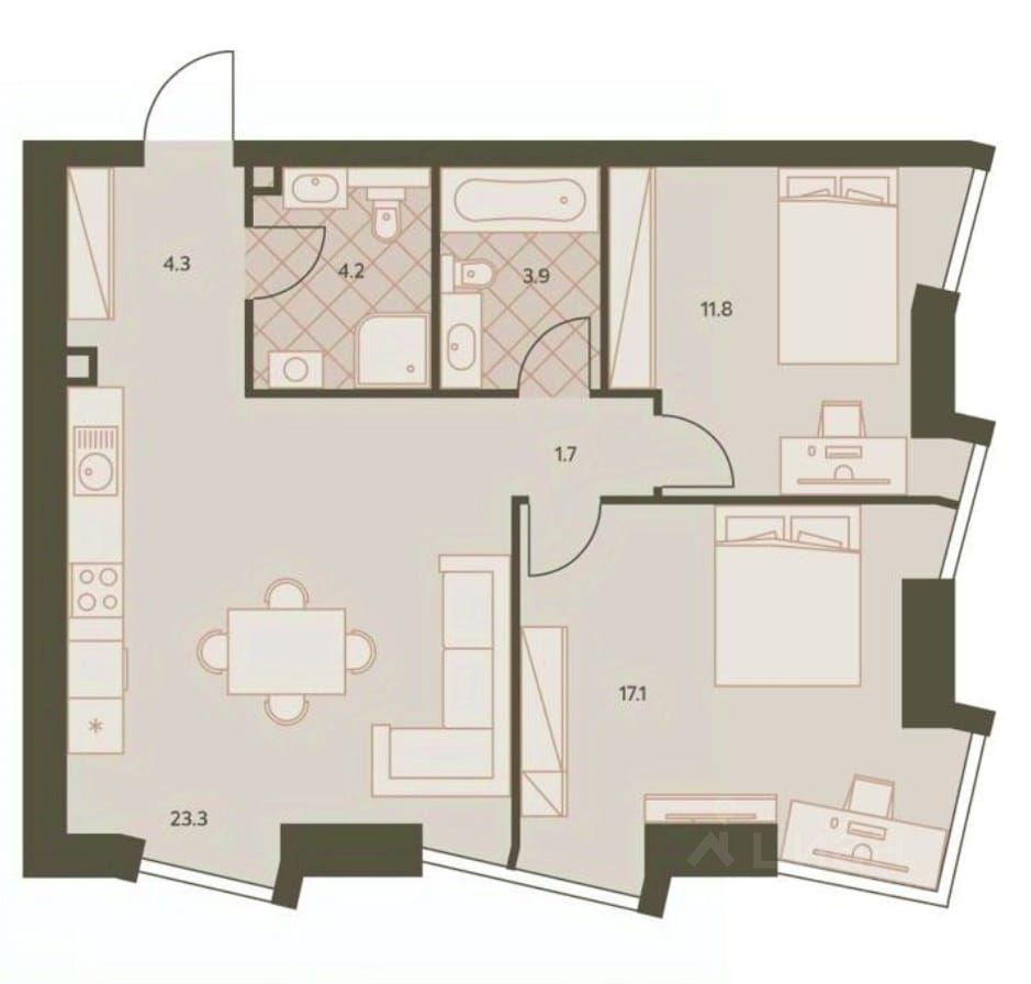 Удобный формат планировки: просторная кухня-гостиная, две изолированные спальни, два санузла.В квартире выполнена предчистовая отделка (white box) - стяжка пола, гидроизоляция, разводка систем отопления, электричества, водоснабжения, стены выровнены и оштукатурены. Вам лишь остаётся сделать декоративный ремонт по своему вкусу.