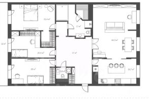 планировка: большая гостиная 44,3 м² со столовой зоной, кухня 19,7 м² с островом, мастер-спальня с вместительной гардеробной, санузел 10,2 м² с сауной и джакузи, детская спальня, гостевая спальня, просторный холл, гостевой санузел. По всему периметру спален - лоджия площадью 10,4 м².