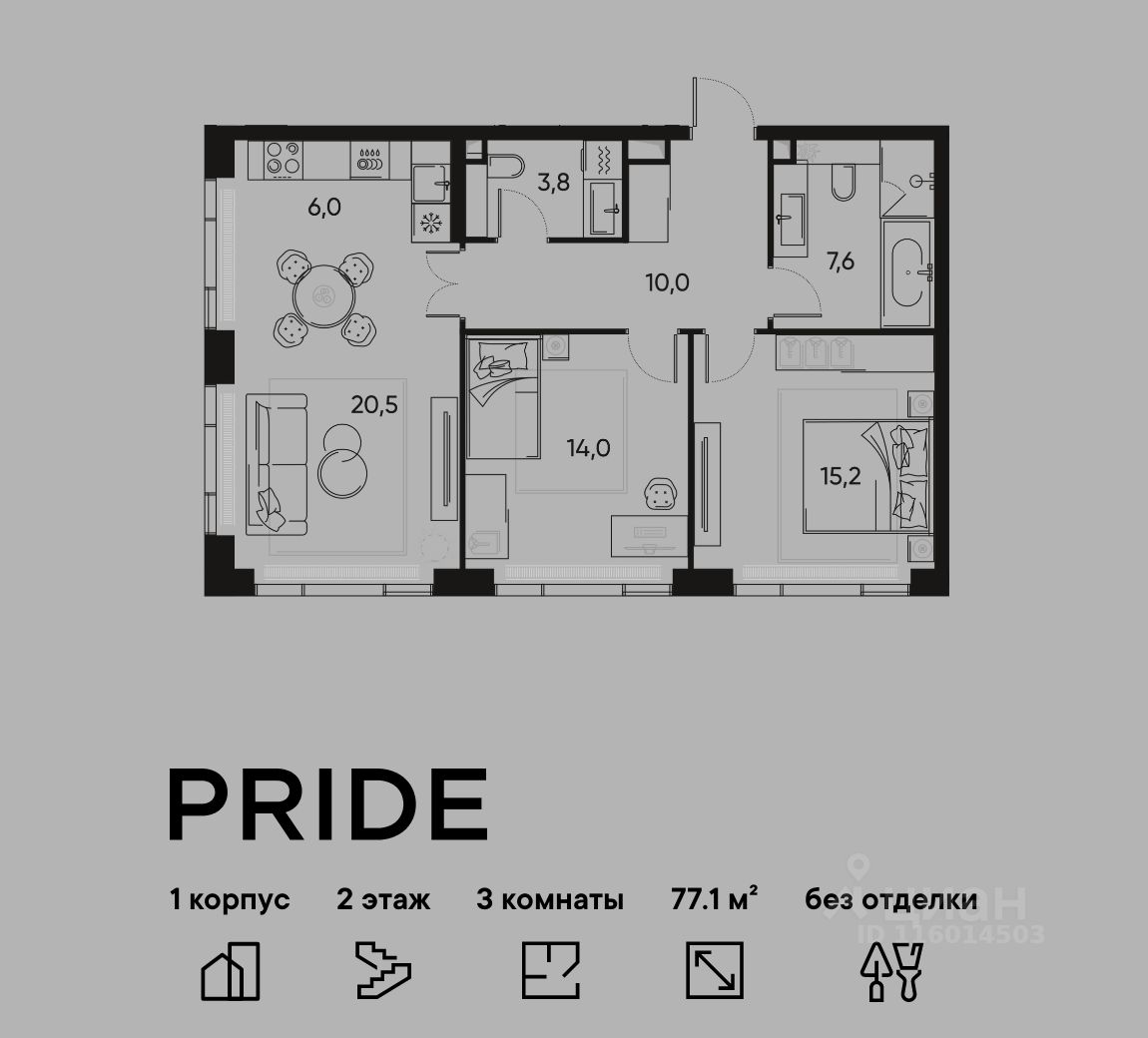 В премиальном жилом квартале PRIDE продается 3-комнатная квартира в 1 корпусе, на 2 этаже, в секции 2. Её общая площадь составляет 77.1 м². Пространство включает 2 уютные спальни 14 м², 15,2 м², просторную кухню-гостиную 25,3 м² и 2 ванные комнаты 3,8 м² и 7,7 м². Ключи в 2026 году.