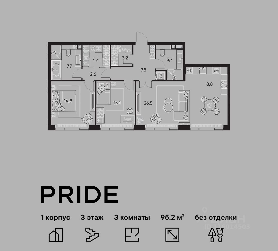 В премиальном жилом квартале PRIDE продается 3-комнатная квартира в 1 корпусе, на 3 этаже, в секции 2. Её общая площадь составляет 95.2 м². Пространство включает 2 уютные спальни 14,8 м², 13,1 м², просторную кухню-гостиную 35,3 м² и 2 ванные комнаты 7,7 м² и 5,7 м².