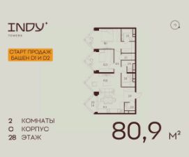 Продается просторная 2-комнатная квартира на 28 этаже жилого комплекса Indy Towers. Вид из окон: во двор. Срок сдачи: 4 кв. 2026 г.