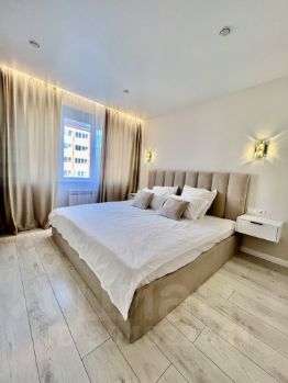 Спальная комната оснащена множеством подсветок, приятных для глаз. В комнате значительная по размерам кровать (200*200) и прикроватные тумбы.