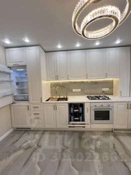 Кухонный гарнитур создан по индивидуальному дизайн проекту. Фартук кухни изготовлен из керамогранита оникс, так же, как и пол. Кухня оборудована современной техникой: встроенными двухметровым холодильником, газовой варочной панелью, духовым шкафом, посудомоечной машиной и стиральной машиной и встроенной вытяжной. Все готово к эксплуатации. В шкафу под раковиной для удобства расположены счетчики. К кухне примыкает утепленная лоджия с оборудованным рабочим местом и освещением.