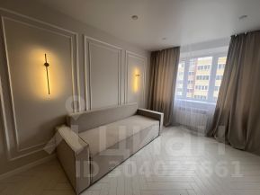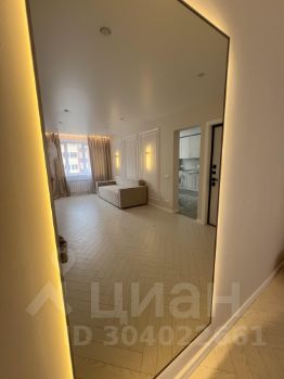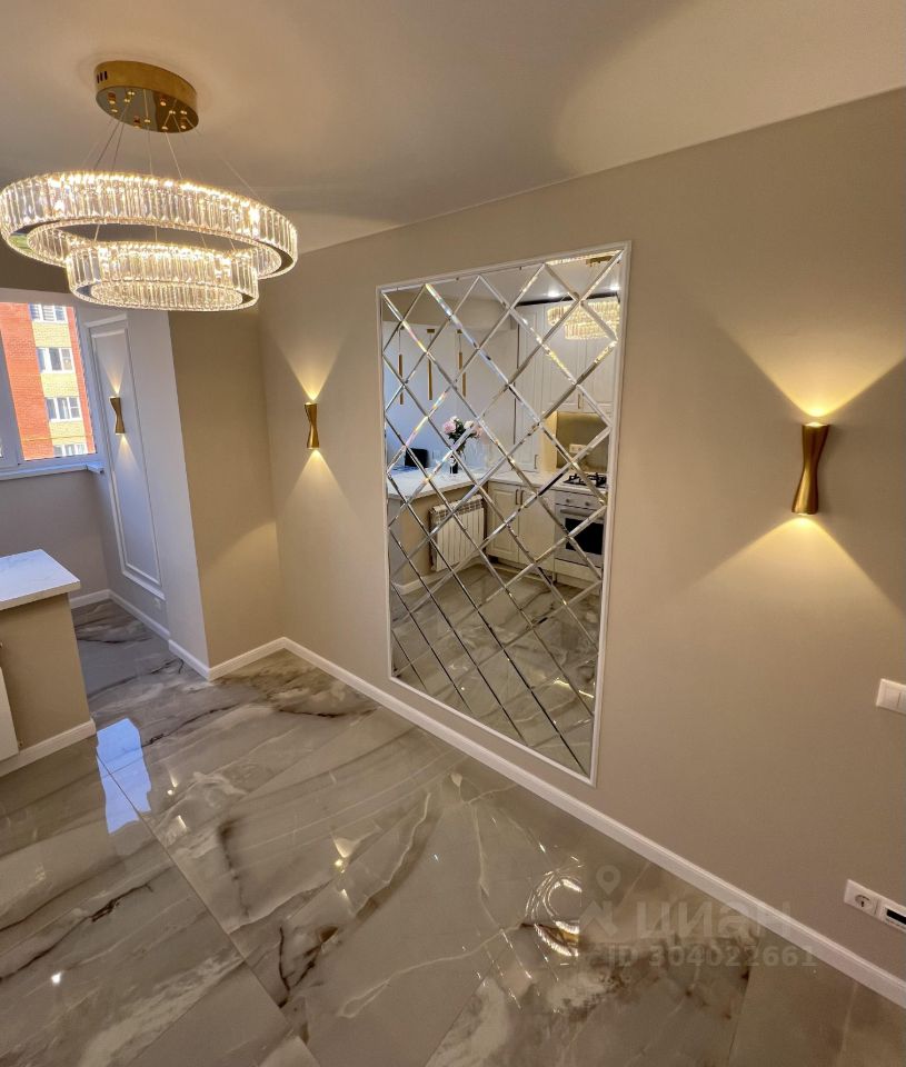 Гостиная обладает диваном, зеркалом и многоуровневой подсветкой.