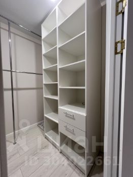 Просторная гардеробная с открытой системой хранения и стеллажами с полками и выдвижными ящиками.