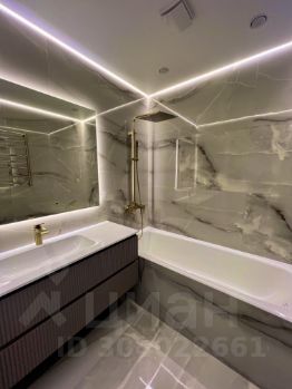 Светлая ванная комната, оснащенная теплым полом, немецкой латунной сантехникой и керамогранитом оникс, с трехрежимовой подсветкой и вытяжкой. К удобствам тумба, в котором расположились места для хранения. Электрический полотенцесушитель с терморегулятором.
