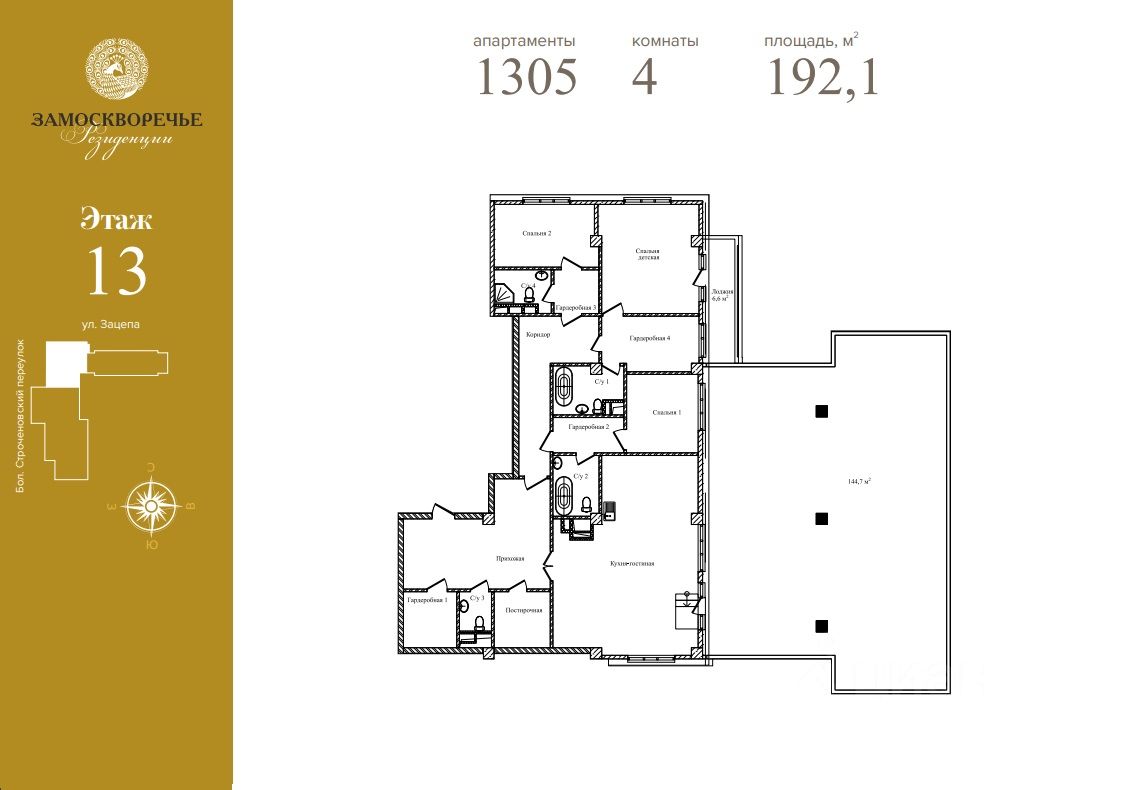 Продаются апартаменты площадью 192,1 кв.м с выходом на кровлю 144 кв.м. 8 окон.