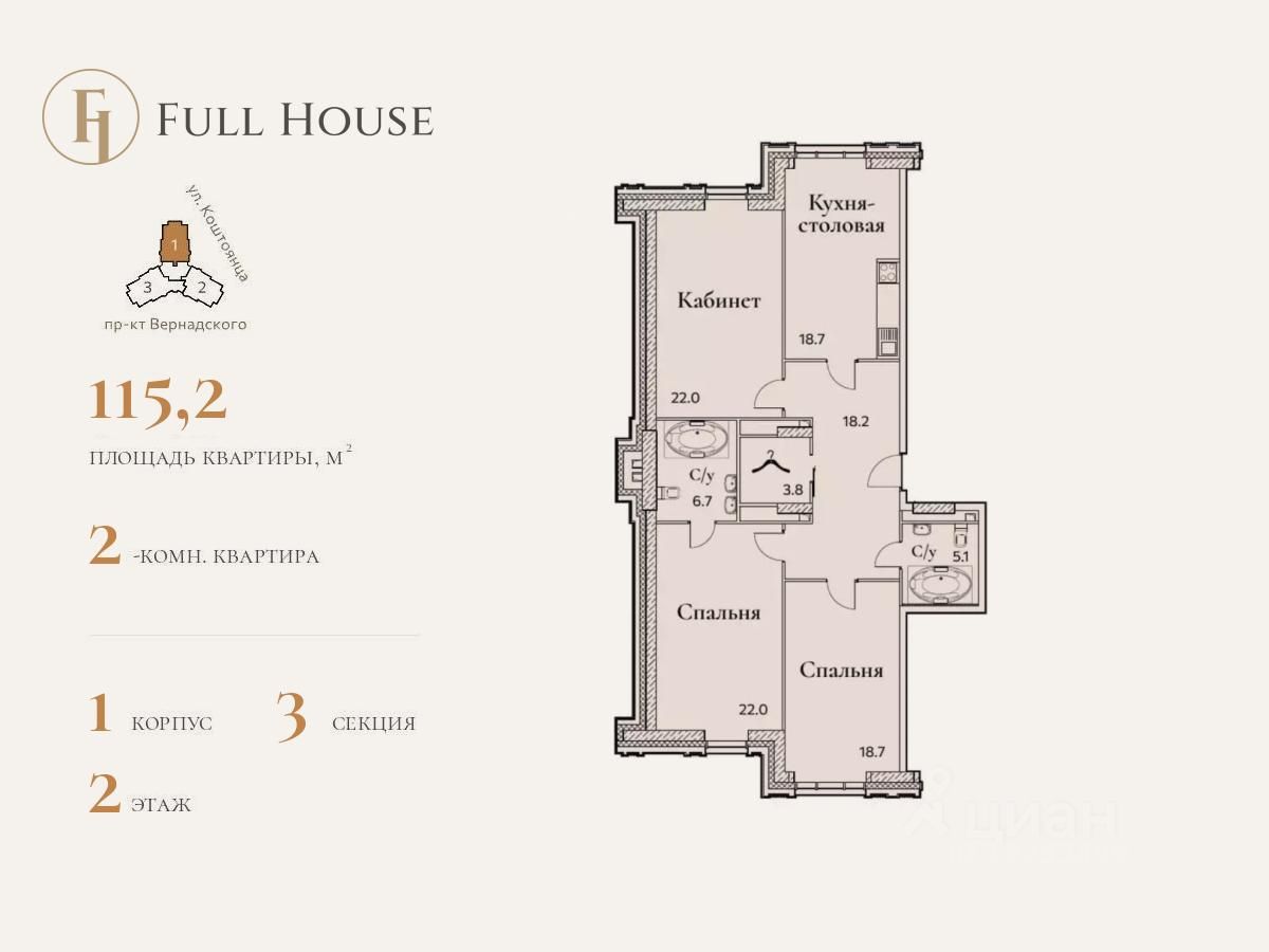 Продается 2-комнатная квартира в ЖК Full House на 2 этаже. Общая площадь квартиры составляет 115,6 кв.м. Квартира без отделки. Дом уже сдан!