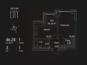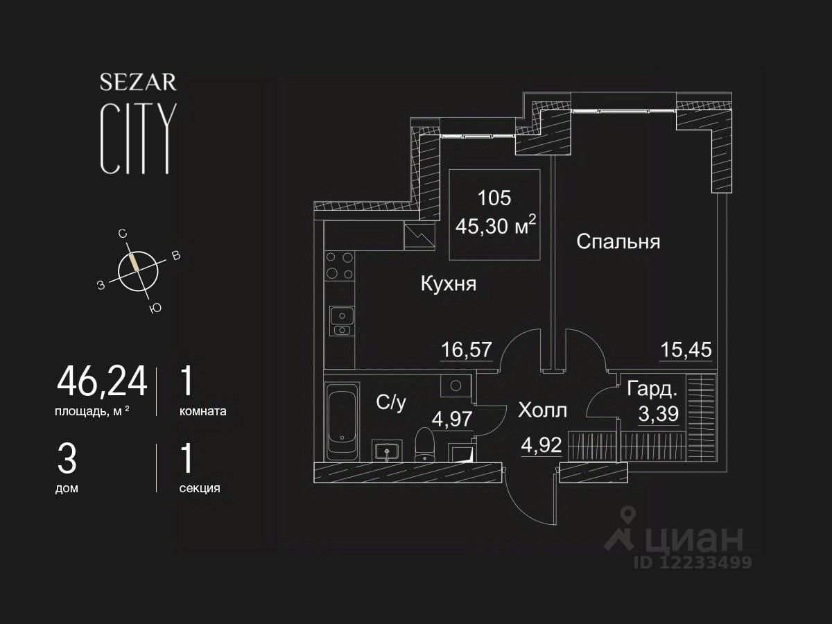 Продается 1-комнатная квартира в ЖК SEZAR CITY на 11 этаже. Общая площадь квартиры составляет 46,24 кв.м. Квартира без отделки. Срок сдачи - 2027 год.