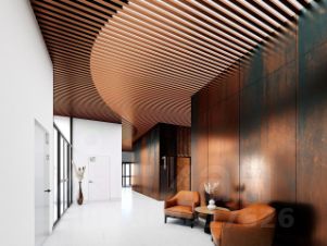 Особое внимание в ВЕЙВ уделено интерьерам лобби, выполненным в современном стиле с контрастными акцентами. Стильное пространство разделено на несколько зон: ресепшен, зона ожидания с Wi-Fi и мягкими креслами, колясочная и лаконичный лифтовый холл.