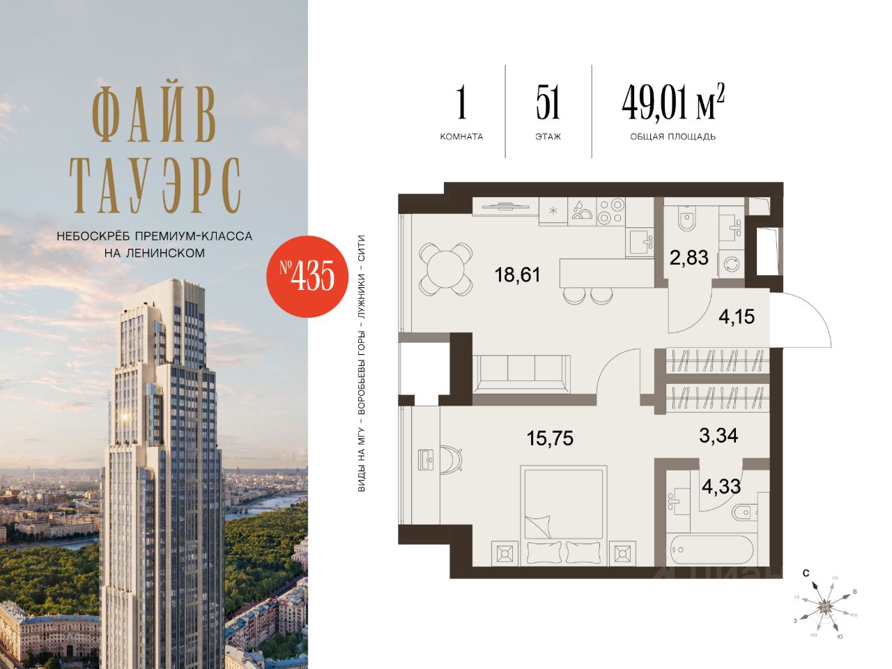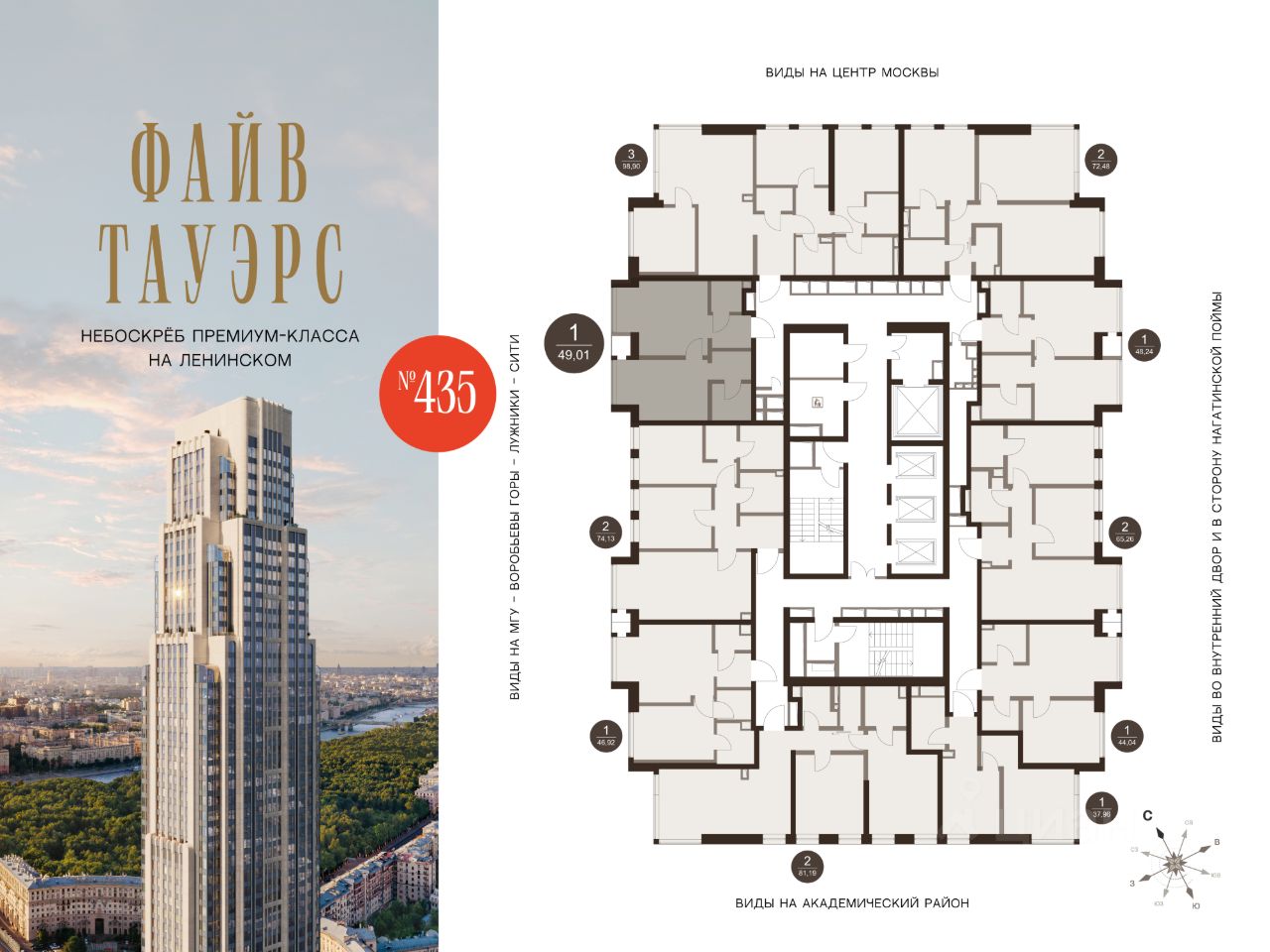 ФАЙВ ТАУЭРС — первый жилой небоскрёб на Ленинском проспекте и самый высокий дом столицы за пределами делового кластера "Москва-Сити". Премиальный небоскрёб представляет собой ультрасовременное, высокотехнологичное здание, идеальный синтез стилей культовых высоток Москвы и небоскребов Нью-Йорка и поражает воображение уникальными видами, монументальной роскошью и совершенством форм. Величественная панорама, открывающаяся из окон вашей квартиры, завораживает: легендарные сталинские высотки, шпиль главного корпуса МГУ, "Москва-Сити", спорткомплекс "Лужники".