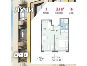 Продается 1-комнатная квартира общей площадью 36.6 кв. метров на 16 этаже жилого комплекса Лучи.