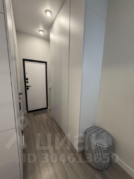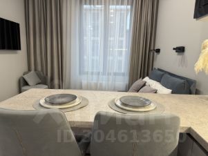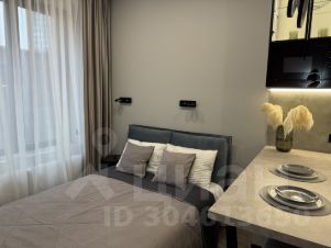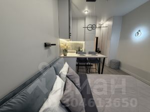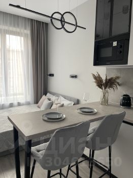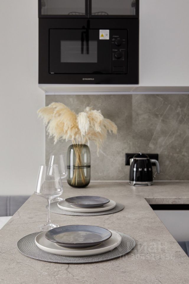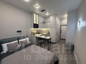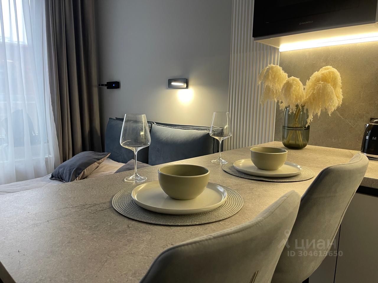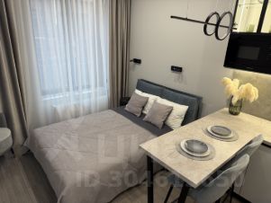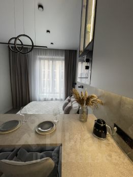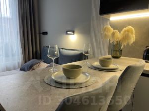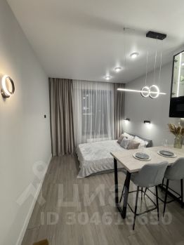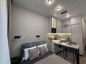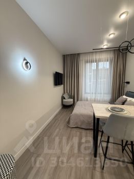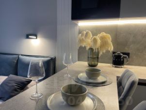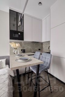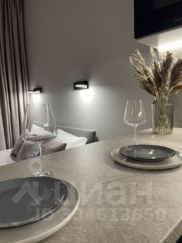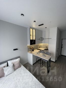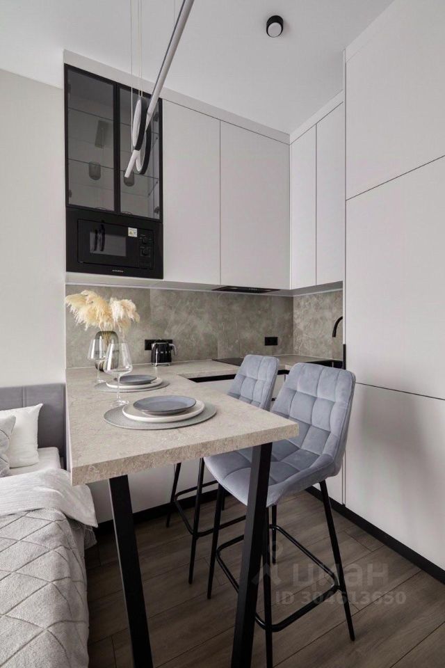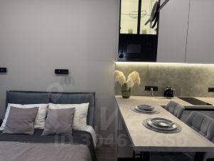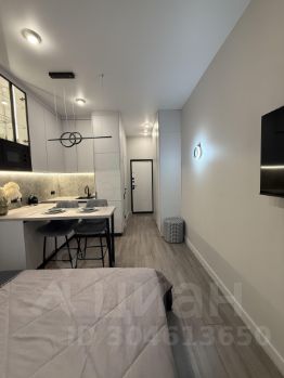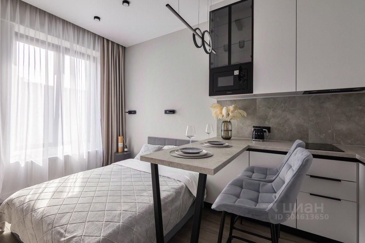Сделан качественный дизайнерский ремонт, студия оснащена новой мебелью, встроенными шкафами, а также всей необходимой встроенной техникой: посудомоечная машина, холодильник, варочная панель, вытяжка, СВЧ, стиральная машина, телевизор.