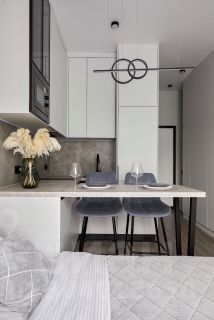 Пространство зонировано для комфортной жизни- зона кухни с барной стойкой, которую можно использовать в качестве рабочей зоны, зона спальни с полноценной двухспальной кроватью и очень удобным матрасом, предусмотрено достаточно мест хранения и множество вариантов освещения, а также имеется балкон- зона релакса.