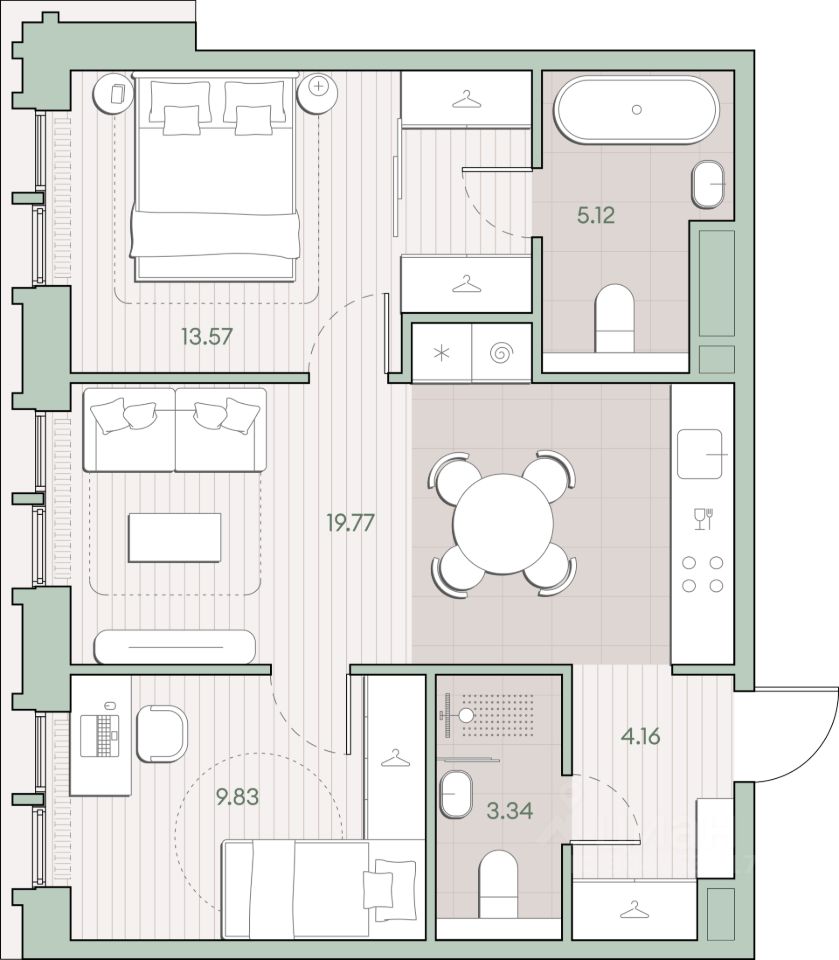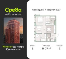 Продаётся 2-комнатная квартира общей площадью 55.79 кв.м. без отделки. Квартира расположена на 2 этаже корпуса 4.2 в жилом комплексе бизнес-класса "Среда на Кутузовском" в пешей доступности от метро "Кунцевская".