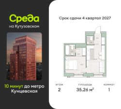 Продаётся 1-комнатная квартира общей площадью 35.26 кв.м. с отделкой white box. Квартира расположена на 2 этаже корпуса 5 в жилом комплексе бизнес-класса "Среда на Кутузовском" в пешей доступности от метро "Кунцевская".