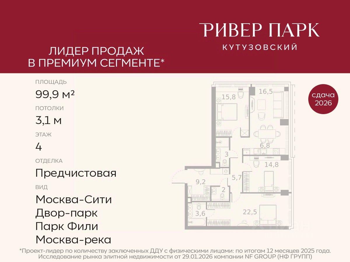 Продается 3-к квартира площадью 99.9 кв.м. на 4-м этаже в жилом комплексе премиум-класса Ривер Парк Кутузовский в Башне Изумруд