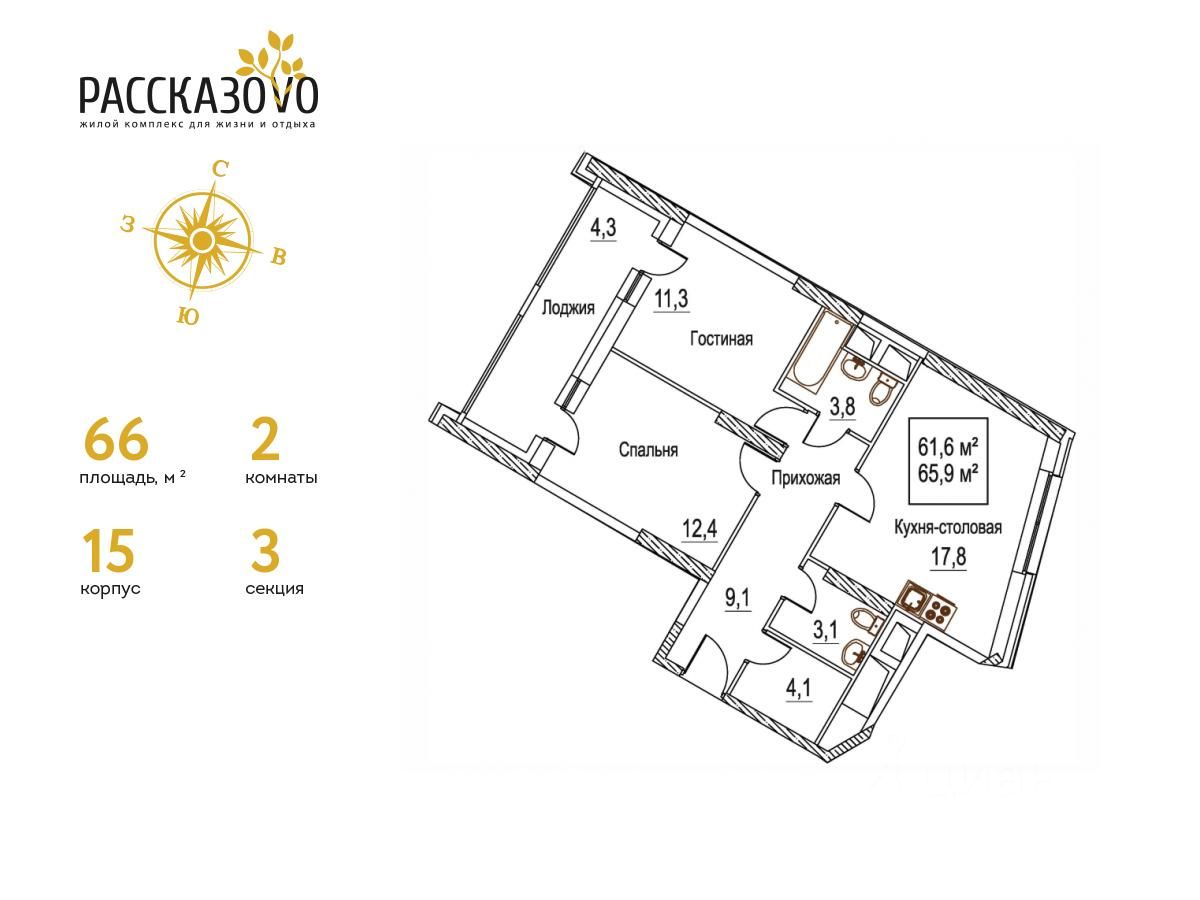 Продается 2-комнатная квартира в ЖК Рассказово на 11 этаже. Общая площадь квартиры составляет 66,3 кв.м. Квартира без отделки.