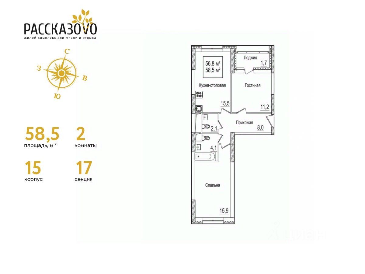 Продается 2-комнатная квартира в ЖК Рассказово на 18 этаже. Общая площадь квартиры составляет 58,9 кв.м. Квартира без отделки.