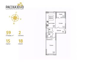 Продается 2-комнатная квартира в ЖК Рассказово на 22 этаже. Общая площадь квартиры составляет 59,4 кв.м. Квартира без отделки.