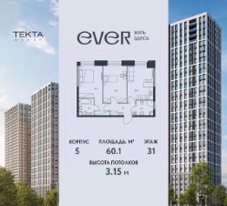 3-комн. квартира в ЖК "Ever" на 31 этаже в 34 этажном здании Корпус 5. Общая площадь: 60.1 кв.м., жилая: 41.9 кв.м. Высота потолков 3.15 м.