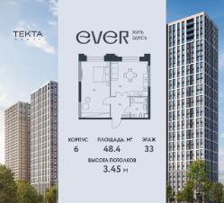 2-комн. квартира в ЖК "Ever" на 33 этаже в 34 этажном здании Корпус 6. Общая площадь: 48.4 кв.м., жилая: 33.1 кв.м. Высота потолков 3.45 м.