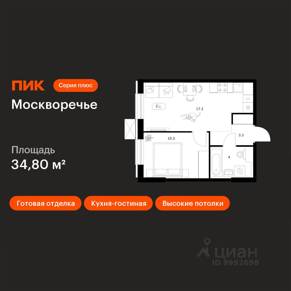 Продаётся 1-комн. квартира площадью 34,8 кв.м на 1 этаже 17 этажного дома (Корпус 1.2, Секция 2) проекта ПИК Москворечье. Светлый просторный подъезд на уровне земли, функциональная планировка, большие окна, c отделкой.