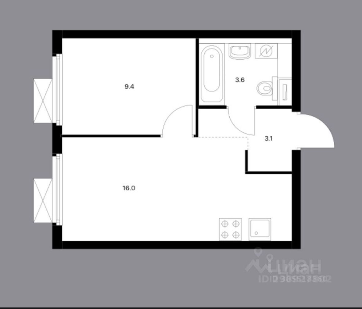 Квартира общей площадью 32.1 м2 с идеальной планировкой и с чистовой отделкой (обои, ламинат, плитка, вся сантехника, натяжные потолки, двери и широкоформатные окна):