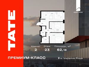 Продается 2-комнатная квартира от застройщика в ЖК премиум-класса TATE на 23 этаже. Общая площадь 62,18 м². Отделка предчистовая (white box). 2 санузла. Вид из окна на Парк Сокольники. Мастер-спальня. Башня A.