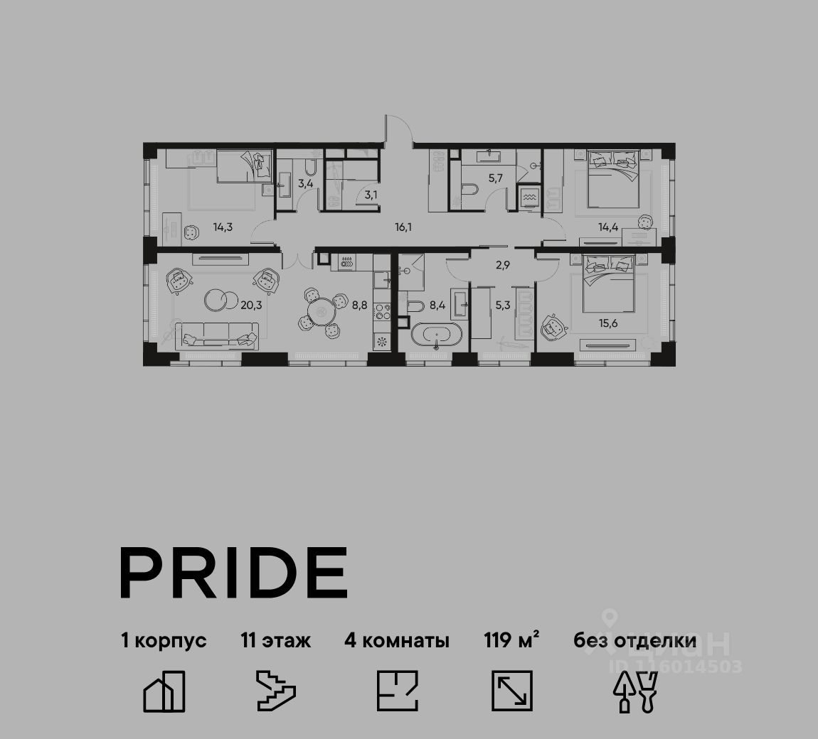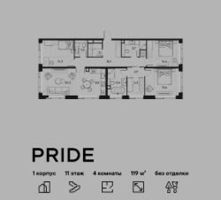 В премиальном жилом квартале PRIDE продается 4-комнатная квартира в 1 корпусе, на 11 этаже, в секции 6. Её общая площадь составляет 119 м². Пространство включает 3 уютные спальни 14,3 м², 14,4 м², 15,8 м², просторную кухню-гостиную 29,2 м² и 2 ванные комнаты 8,4 м² и 5,7 м².