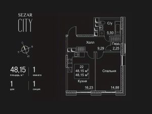 Продается 1-комнатная квартира в ЖК SEZAR CITY на 6 этаже. Общая площадь квартиры составляет 48,15 кв.м. Квартира без отделки. Срок сдачи - 2027 год.