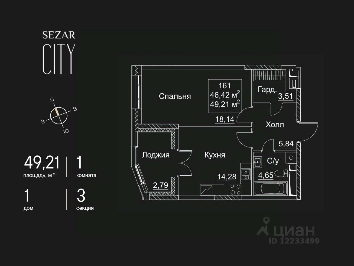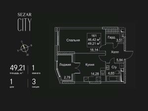 Продается 1-комнатная квартира в ЖК SEZAR CITY на 11 этаже. Общая площадь квартиры составляет 49,21 кв.м. Квартира без отделки. Срок сдачи - 2027 год.