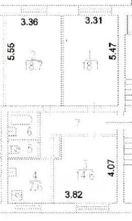 Три изолированные комнаты площадью 51.4 кв.м., по комнатам: 18.7, 18.1 и 14.6 кв.м., кухня 7.6 кв.м., раздельный санузел.