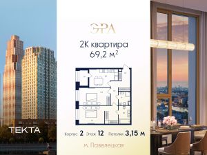 2-комн. квартира в ЖК "ЭРА" на 12 этаже в 33 этажном здании Корпус 2. Общая площадь: 69.2 кв.м., жилая: 33.70 кв.м. Высота потолков 3.15 м.