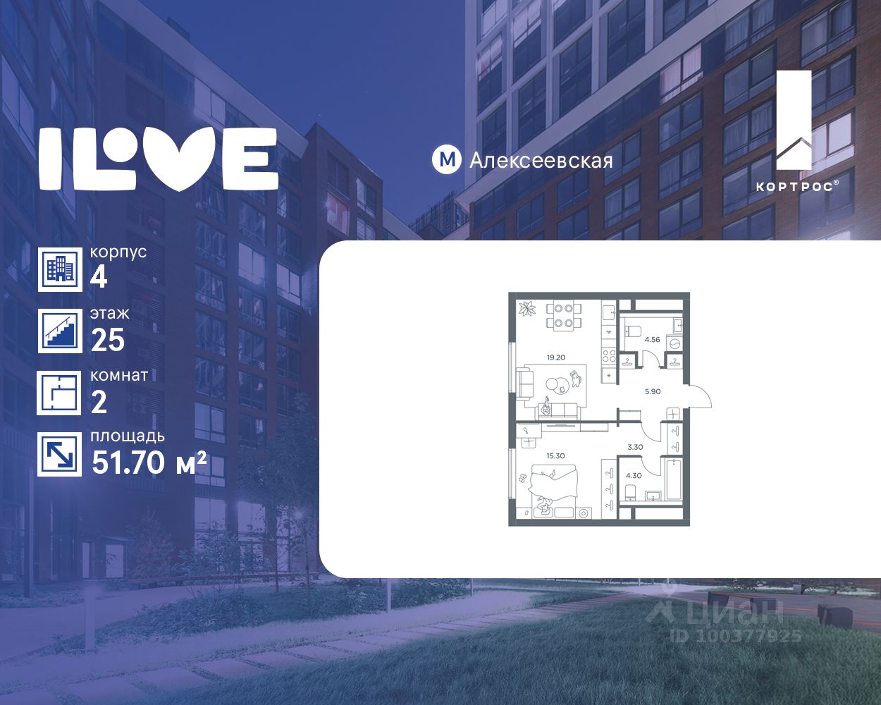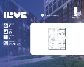 Продаётся 2-комнатная квартира общей площадью 51.70 кв. метров на 25 этаже жилого квартала бизнес-класса iLove. Без отделки, 2 санузла. Мастер-спальня с гардеробной. Просторная кухня-гостиная. Ниша для гардеробной.