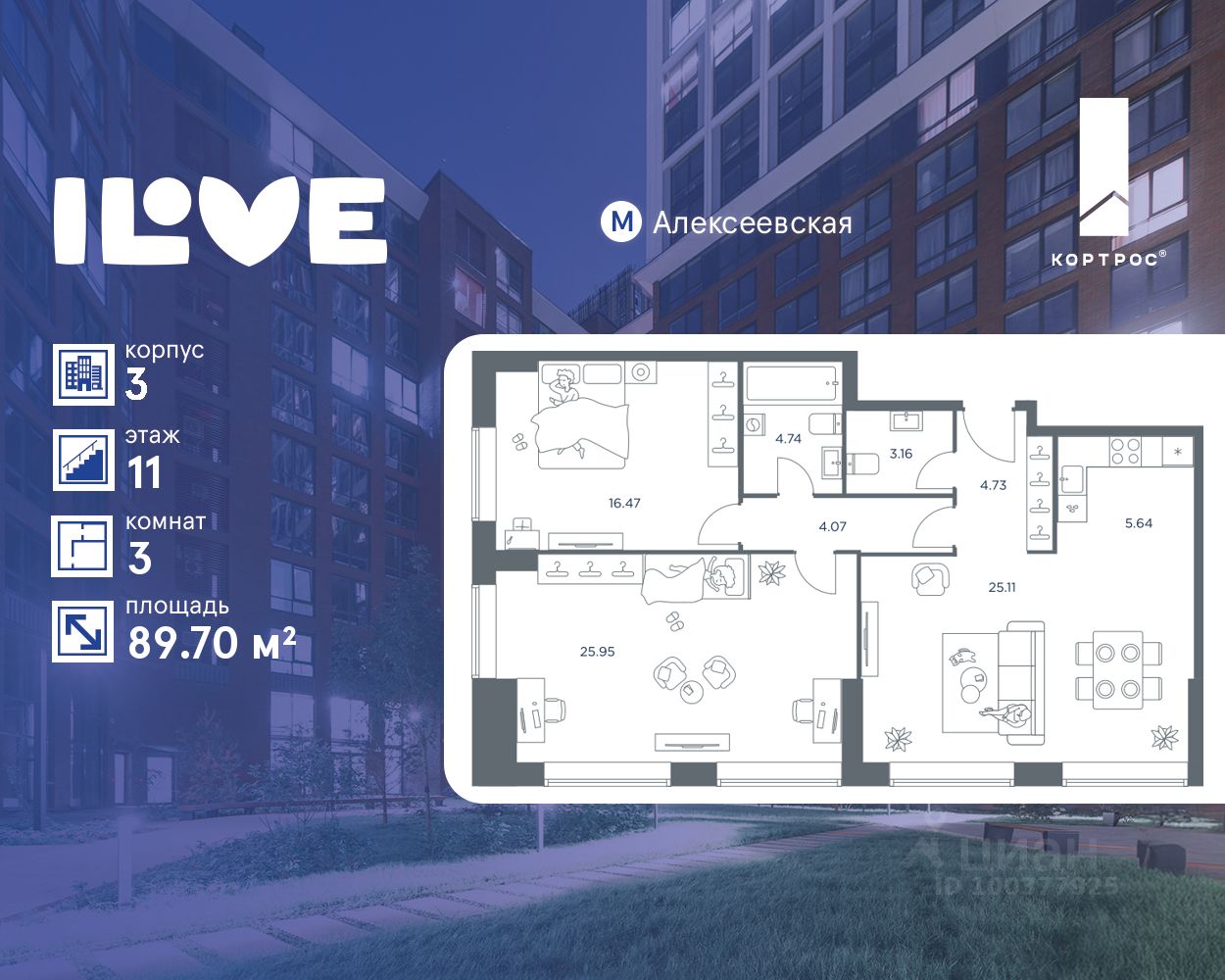 Продаётся 3-комнатная квартира общей площадью 89.70 кв. м на 11 этаже жилого квартала бизнес-класса iLove. Без отделки, 2 санузла. Мастер-спальня с гардеробной. Просторная кухня-гостиная. Ниша для гардеробной.