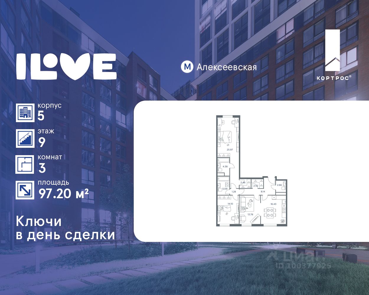 Продаётся 3-комнатная квартира общей площадью 97.20 кв. м на 9 этаже жилого квартала бизнес-класса iLove. Кухня-гостиная и комнаты в квартире просторные и светлые благодаря широкоформатному остеклению. Приватная мастер-спальня расположена обособленно в отдельной части квартиры, что обеспечивает уединение и комфорт. В квартире предусмотрено 2 гардеробных комнаты и 3 санузла. Окна выходят на разные стороны, из окна мастер-спальни открывается вид на Останкинскую телебашню. Квартира продается без отделки.