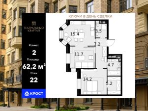 Площадь квартиры составляет 62,20 кв.м и находится на 22-ом этаже 24-этажного здания. Концепция комплекса вдохновлена театральной тематикой, предлагая сочетание неоклассической архитектуры с оригинальной отделкой холлов, изысканными фасадами и созданием культурно-просветительского пространства.