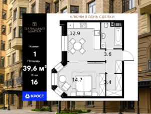 Площадь квартиры составляет 39,60 кв.м и находится на 16-ом этаже 19-этажного здания. Концепция комплекса вдохновлена театральной тематикой, предлагая сочетание неоклассической архитектуры с оригинальной отделкой холлов, изысканными фасадами и созданием культурно-просветительского пространства.