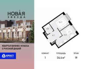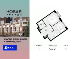 Продаётся 1-к квартира 34.4 кв.м. на 19-м этаже 21 этажного дома, корпус 1 - Резиденция "Вологда". Без отделки.