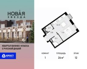 Продаётся 1-к квартира 26 кв.м. на 12-м этаже 21 этажного дома, корпус 1 - Резиденция "Вологда". Без отделки.