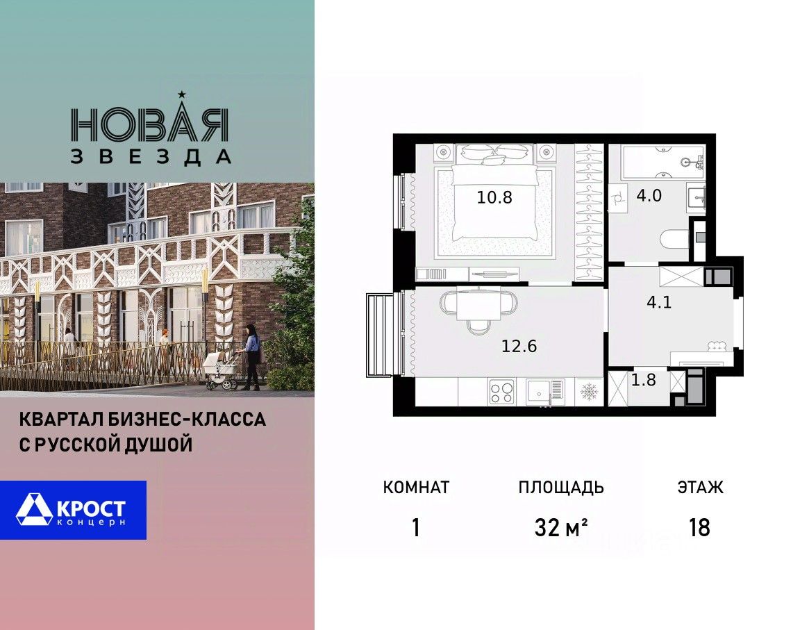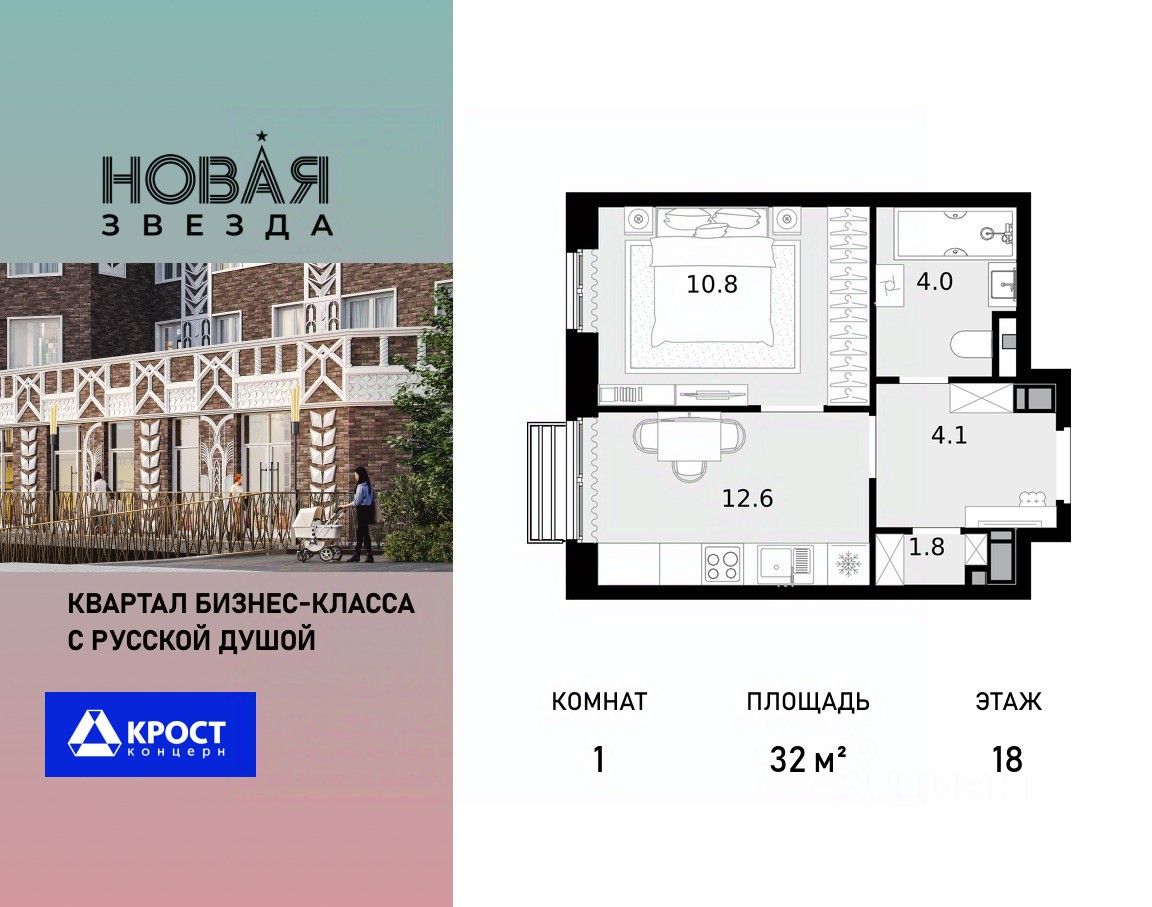 Продаётся 1-к квартира 32 кв.м. на 18-м этаже 21 этажного дома, корпус 1 - Резиденция "Вологда". Без отделки.