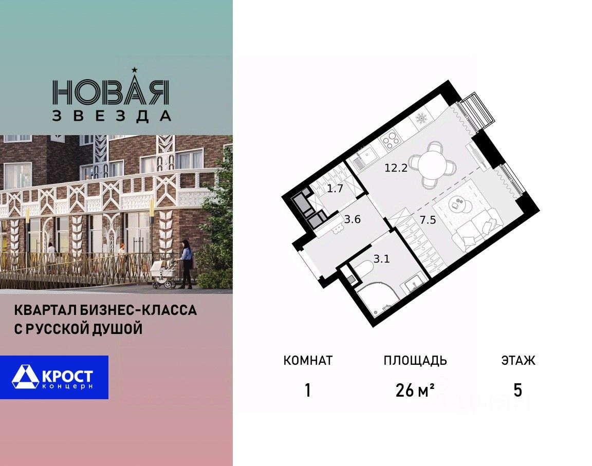 Продаётся 1-к квартира 26 кв.м. на 5-м этаже 21 этажного дома, корпус 1 - Резиденция "Вологда". Без отделки.